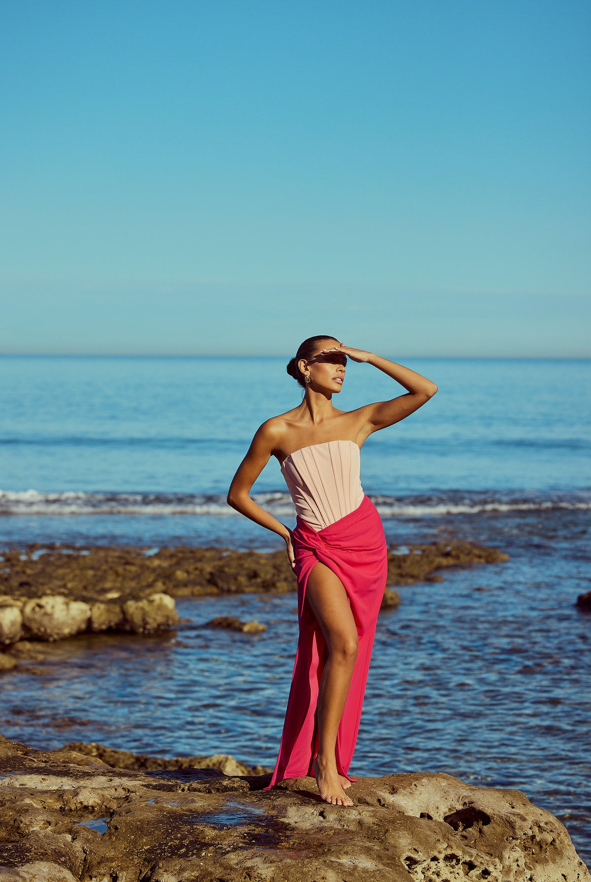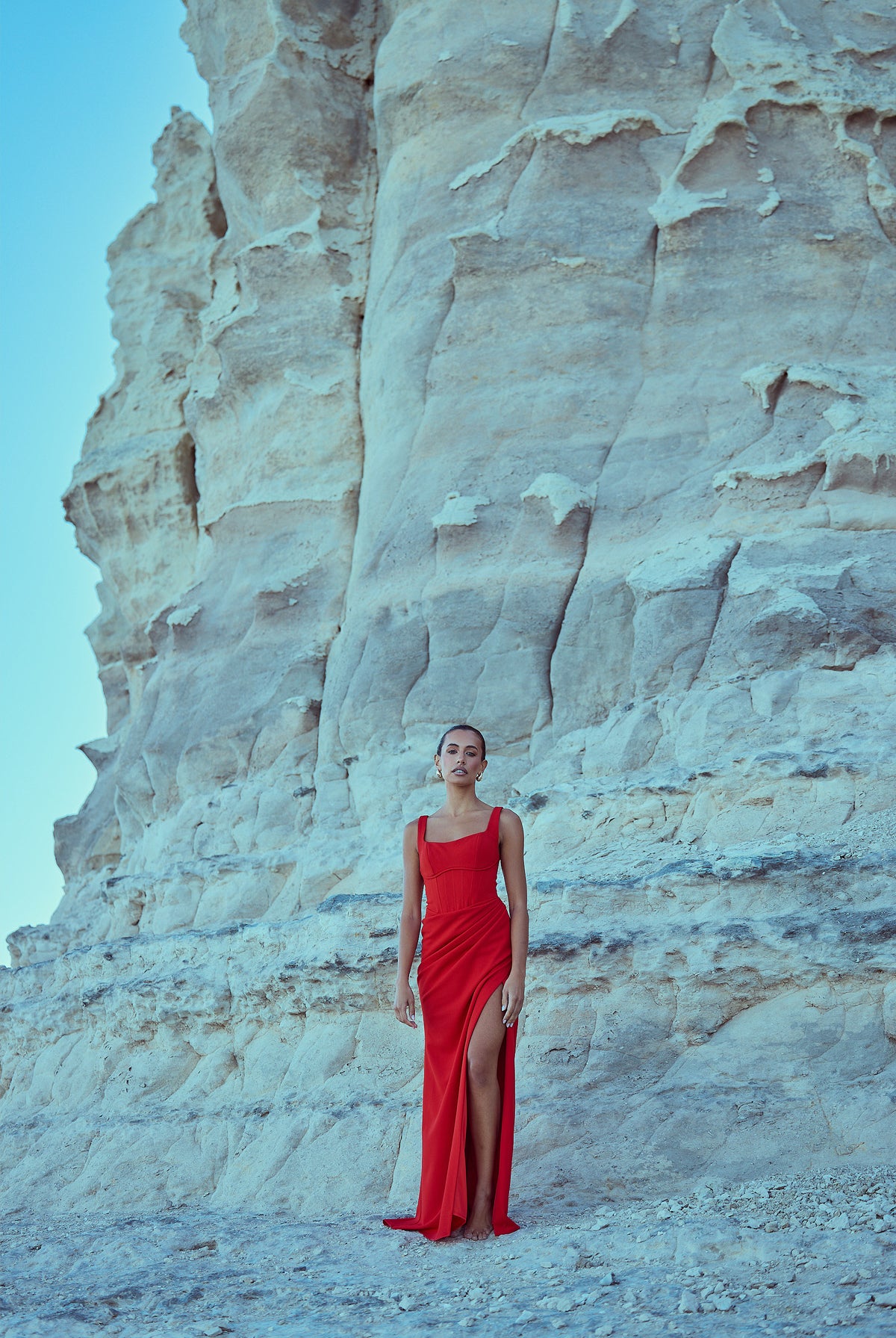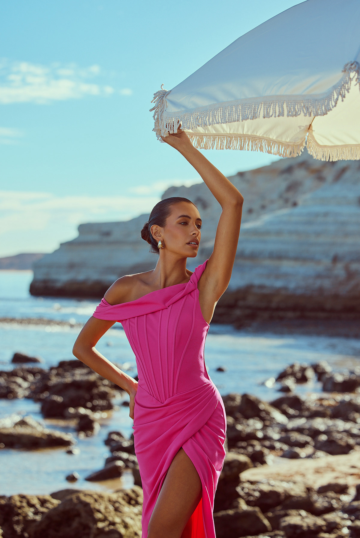 Sotiria is made for the woman who walks with purpose and lives in colour. Drenched in vivid jewel tones - ruby, fuchsia pink, metallic gold and vivid teal - each piece is a testament to transformation, motion, and strength.