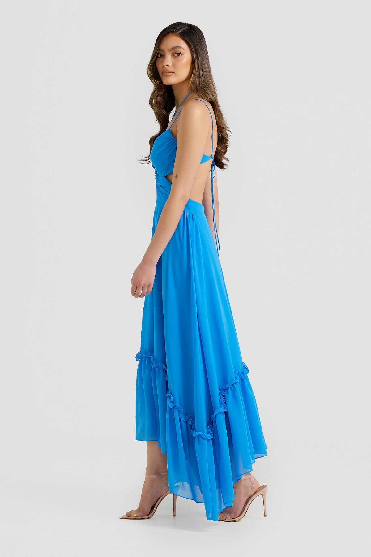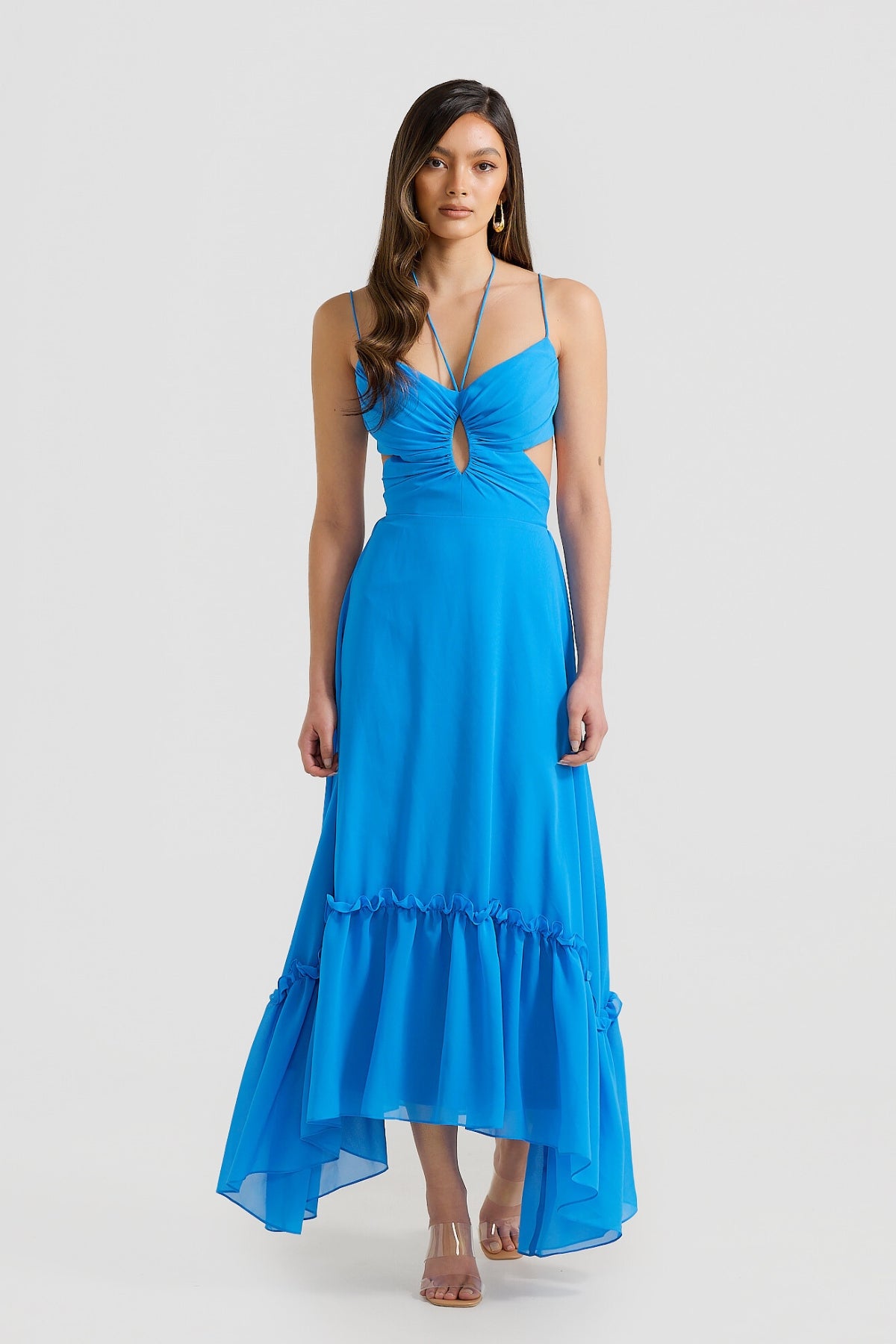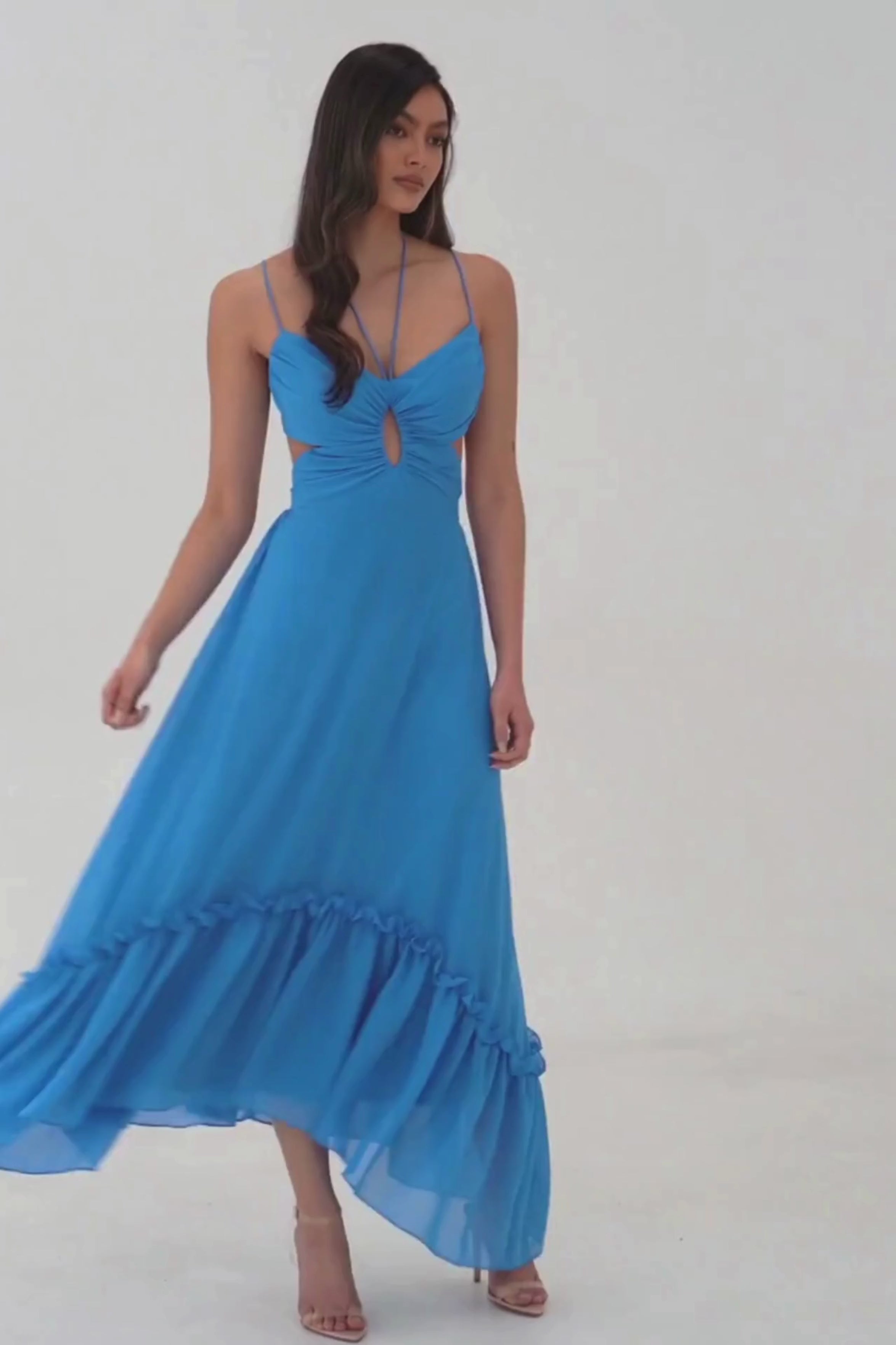 Enjoy special moments this summer in our Gigi Maxi Dress. Featuring an curved hemline and constructed in a floaty chiffon fabrication. The romantic maxi dress features an adjustable tie-up at center back and neck and in-built bra cups for ultimate comfort. Available in Blue and Black.