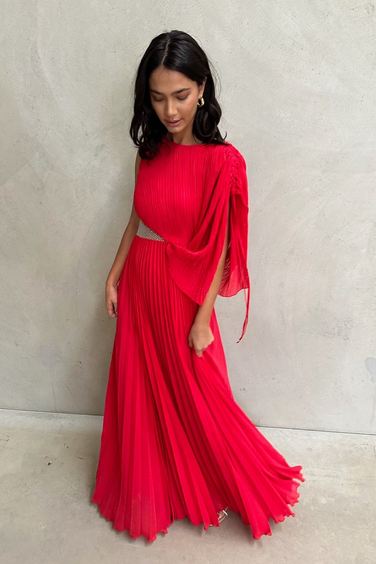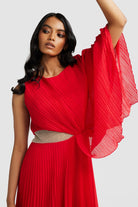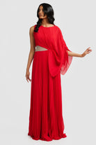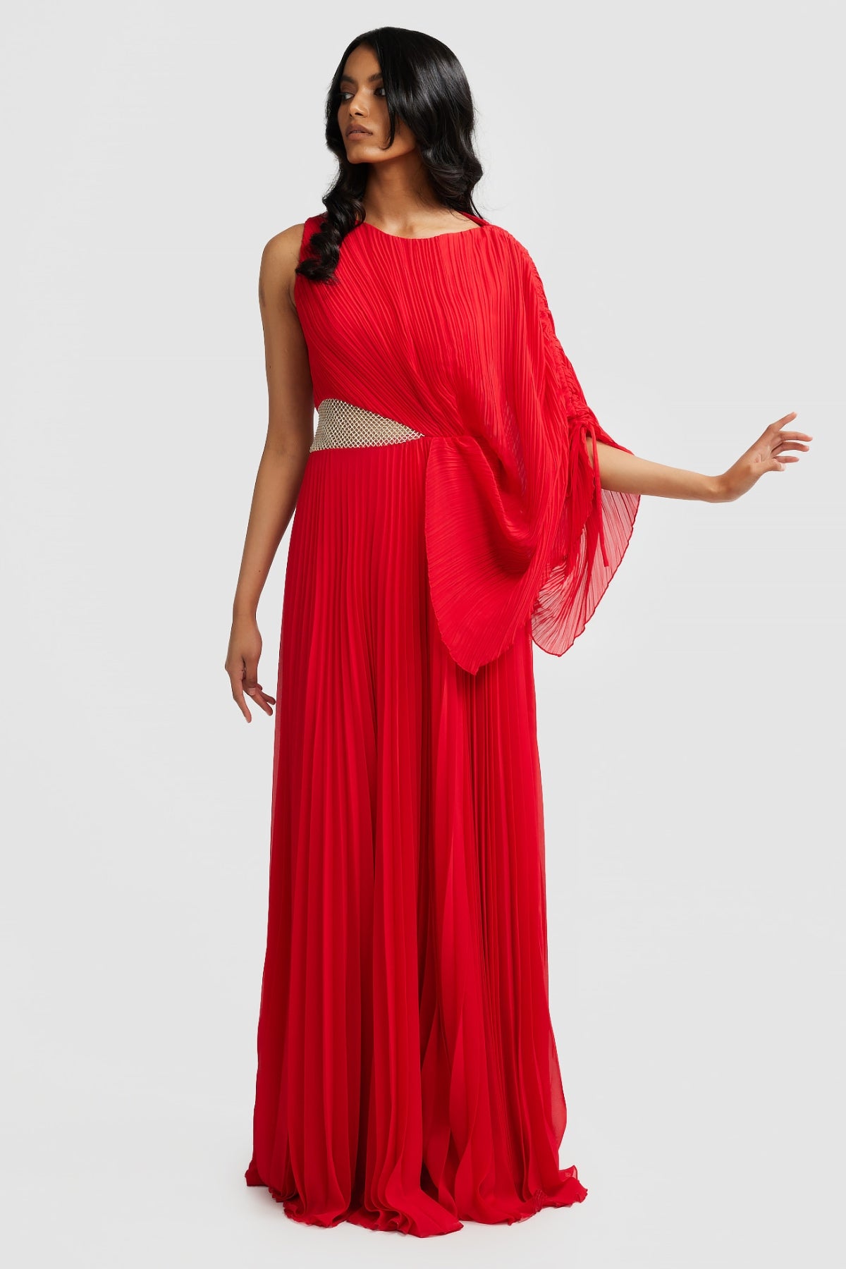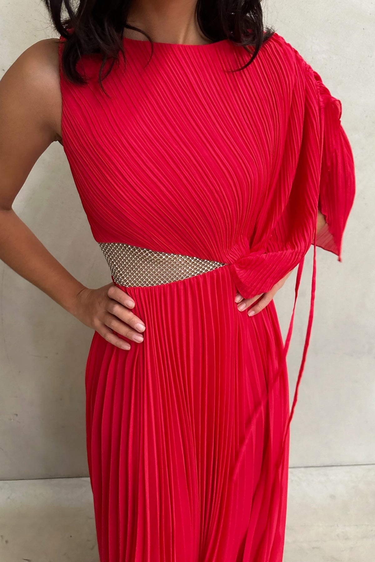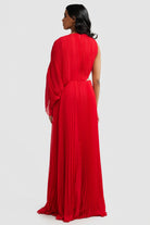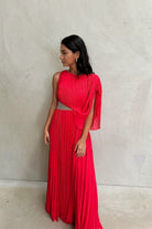 Welcoming the Lorenza Gown, a bold and pleated asymmetrical maxi dress to celebrate your next special occasion. Featuring a boat neckline and draped adjustable sleeve. Elevate your look with a glimmer of sparkle featuring a panel of diamantés amongst a stunning sheer mesh. Available in Black and Raspberry.