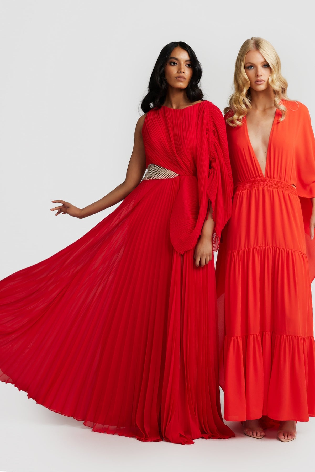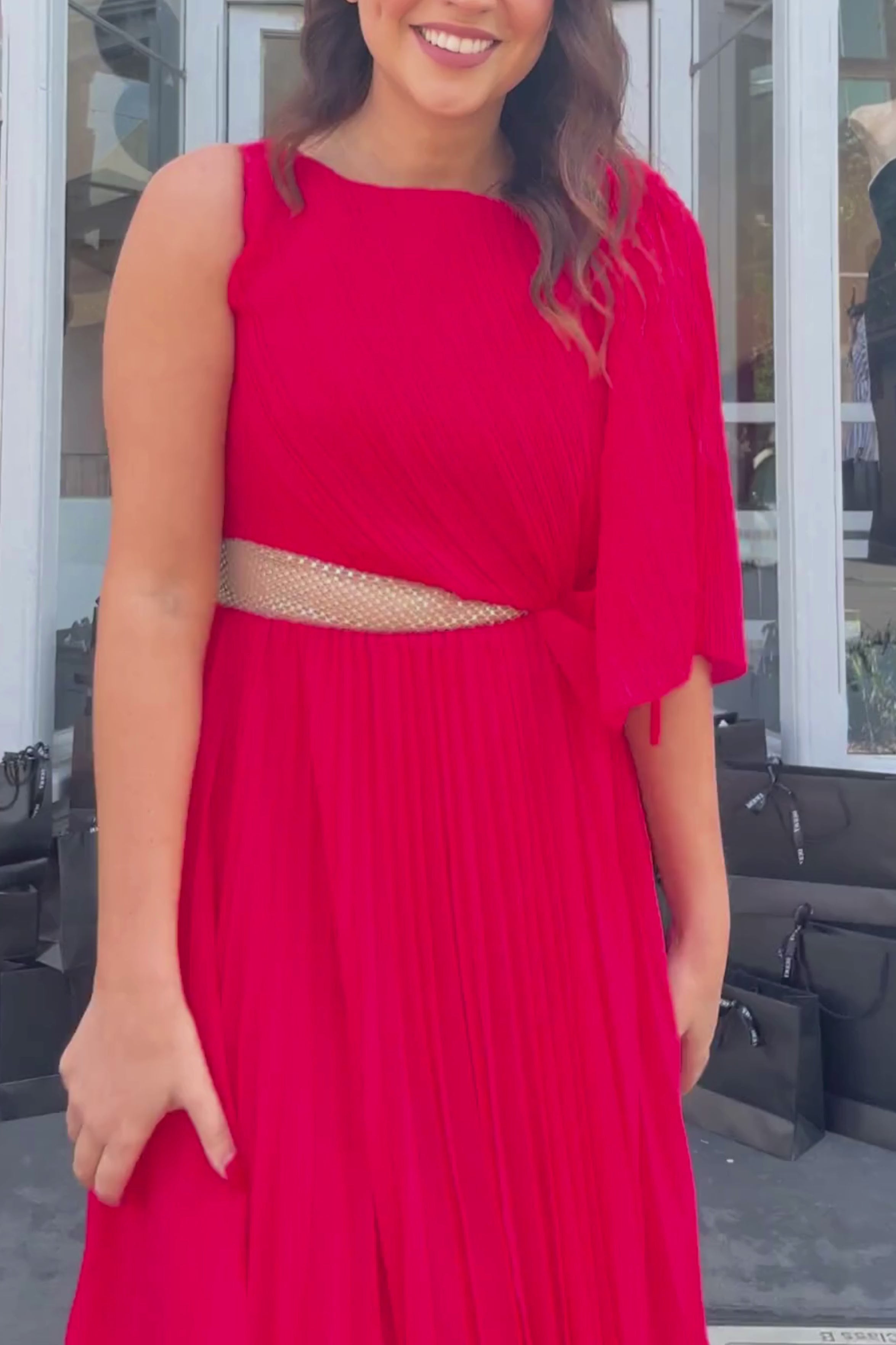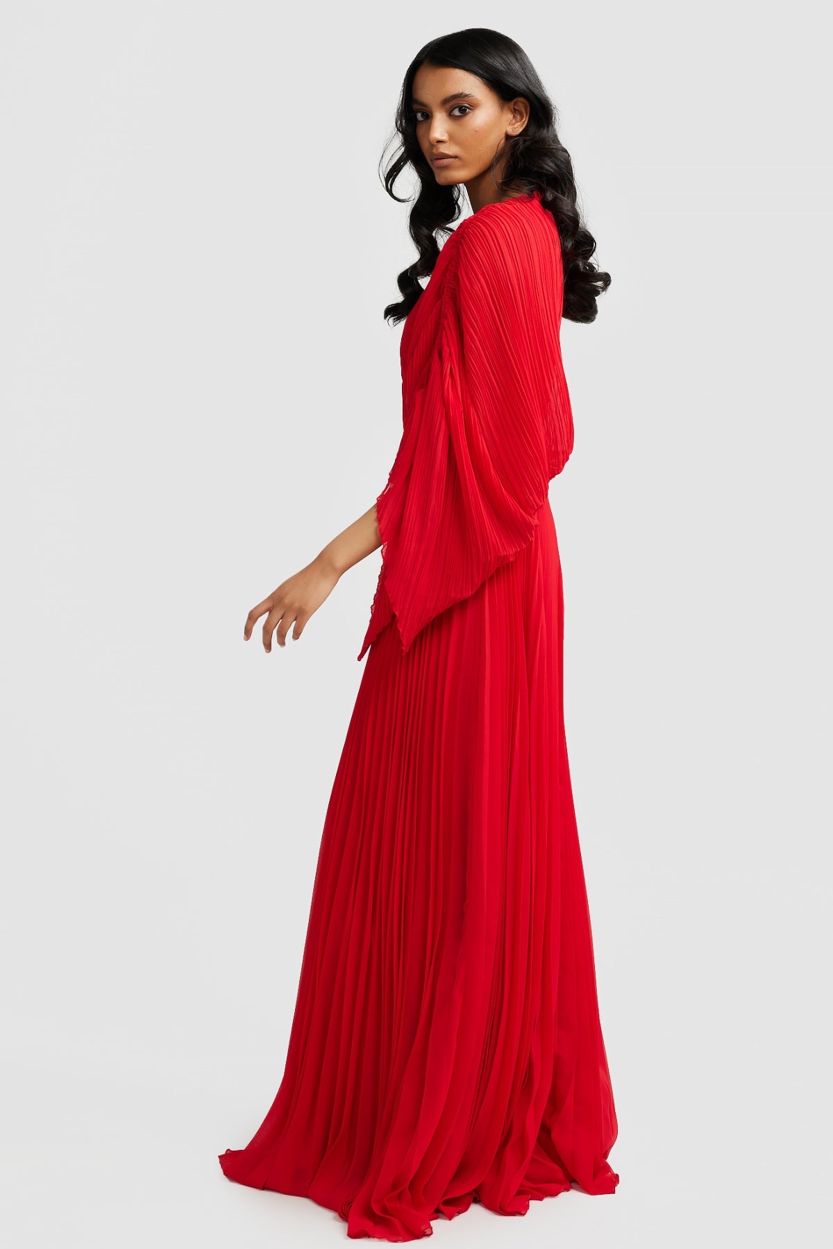 Welcoming the Lorenza Gown, a bold and pleated asymmetrical maxi dress to celebrate your next special occasion. Featuring a boat neckline and draped adjustable sleeve. Elevate your look with a glimmer of sparkle featuring a panel of diamantés amongst a stunning sheer mesh. Available in Black and Raspberry.