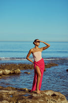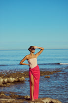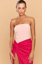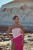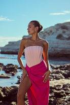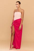 Make a bold statement in the Cinthia Dress, a strapless silhouette crafted in a dreamy two-tone pink palette. This eye-catching design features a fully boned bodice that sculpts and supports, highlighting your natural shape with elegant structure. Fluid in form, the wrap skirt cascades in deliberate folds, anchored by a sharp knot at the hip.