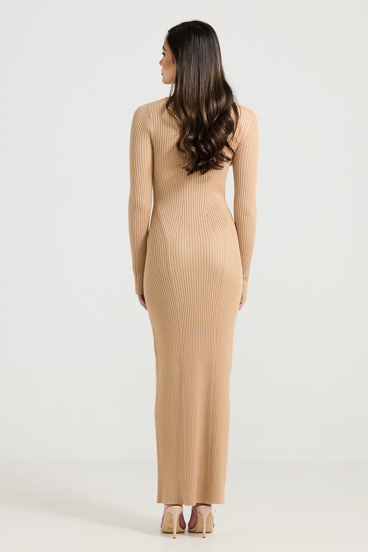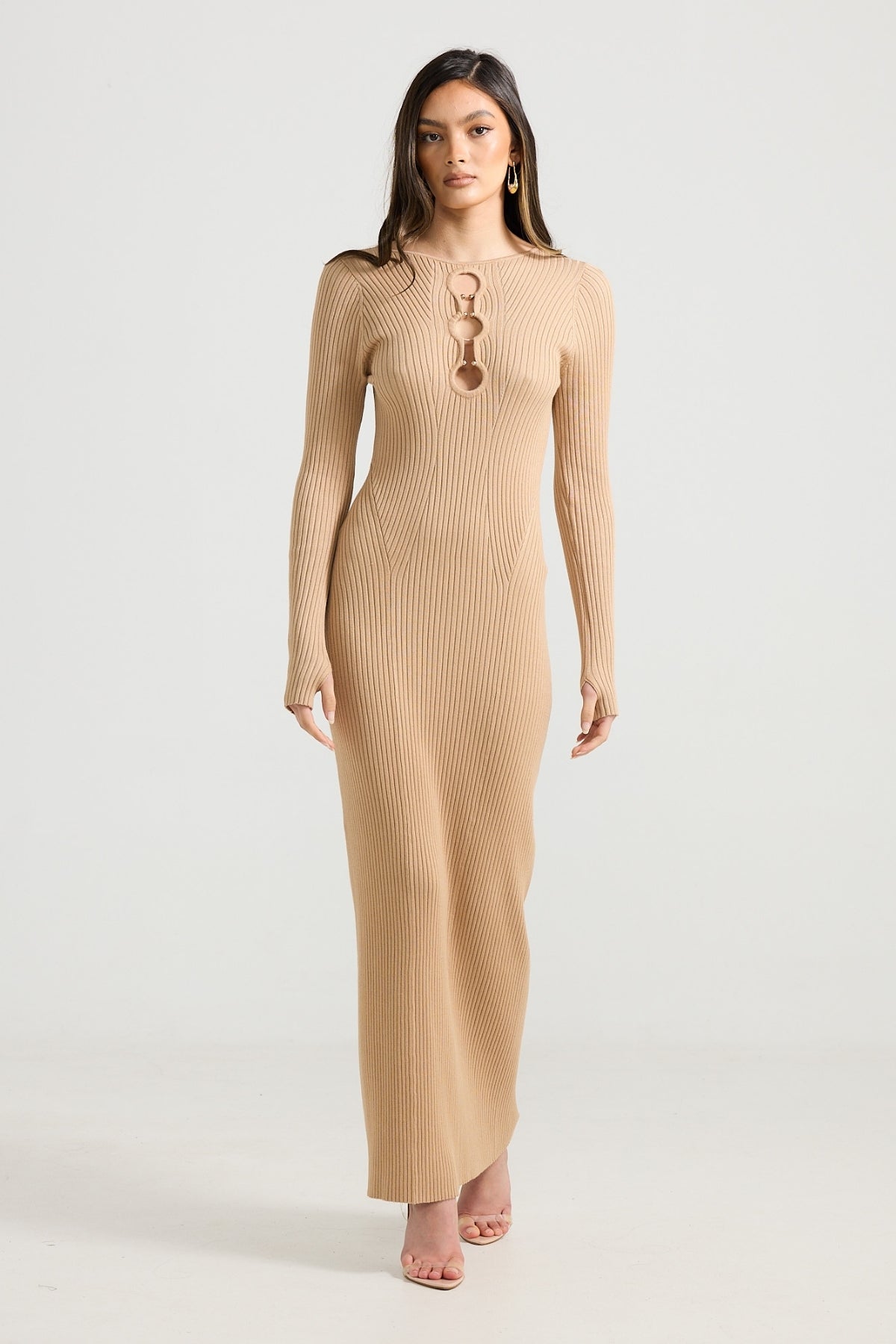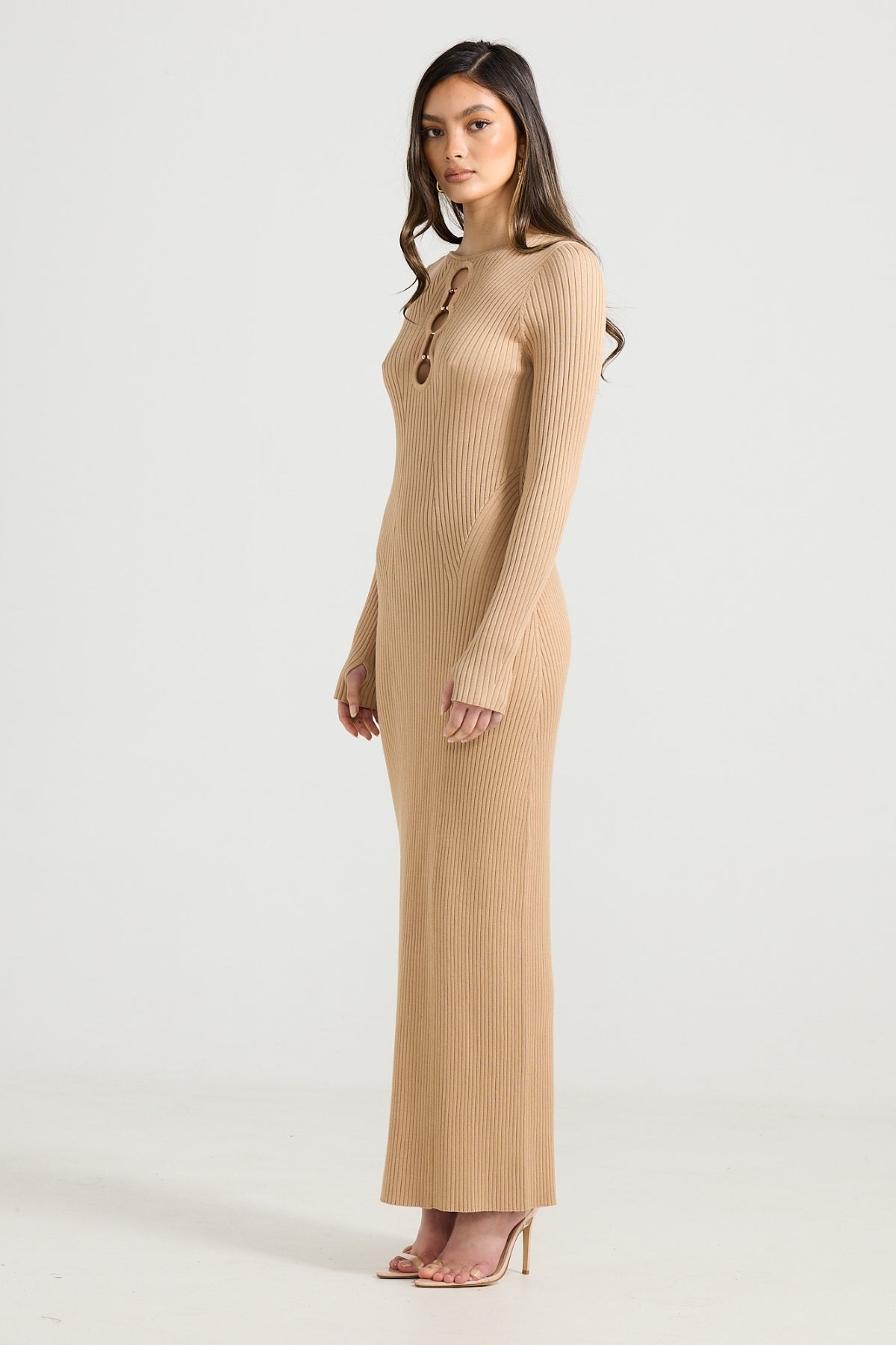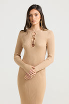 Take your look from day to night in this season’s wardrobe staple. The June rib knit dress features 3 gold rings; a perfect accent to creatively layer under any outerwear or simply wear on its own. The thumb hole detail adds edge and extra comfort. Add a touch of elegance to your casual wear or dress up for the evening. Available in Black and Camel.