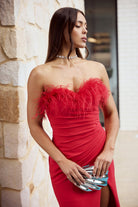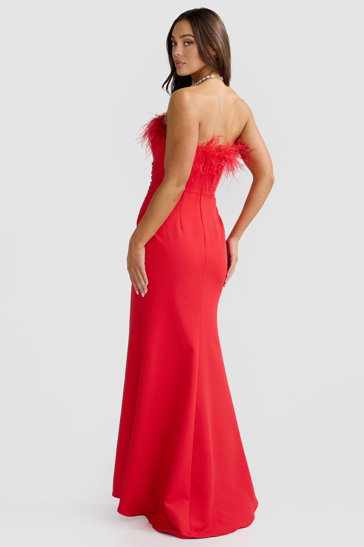 The Milano Gown is a classic silhouette that effortlessly displays grace and elegance. This timeless number incorporates a mermaid silhouette with in-built bra cups and ostrich feather trim neckline. Curated by our well-equipped artisans, the dress has been carefully shaped with flattering tucks at the side waist and a leg split for a sense of sultry to the classic design. Available in Black, Red and White.