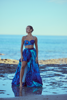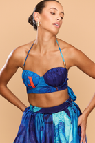 Turn heads in the Arielle Halter Crop Top, a statement piece inspired by the ocean’s vibrant hues. This halter-style top features a sculpted fit with a flattering sweetheart neckline and adjustable back ties for the perfect custom fit. The Sea Print design blends deep blues and aqua tones with bold coral accents. Pair with the matching Melody Bubble Skirt for the ultimate set.