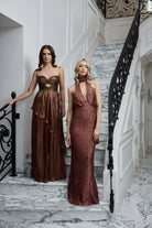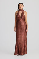 Make a bold statement with the Saskia Halter Dress in bronze. Featuring an adjustable wrap-around neck tie to suit all shapes. Saskia embraces originality in our exquisite embossed metallic satin fabrication. Perfect for bridesmaid dresses or your next black tie event.