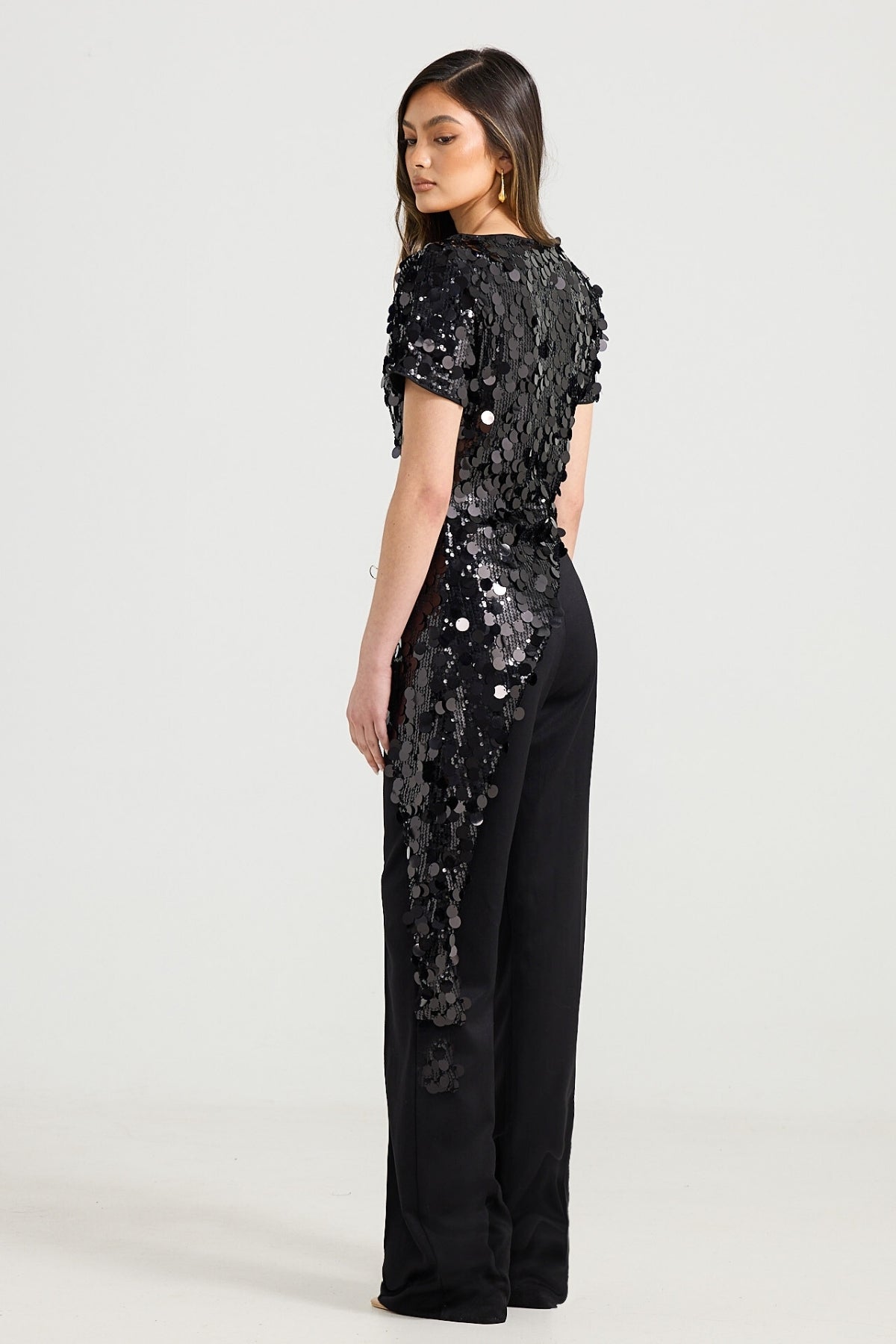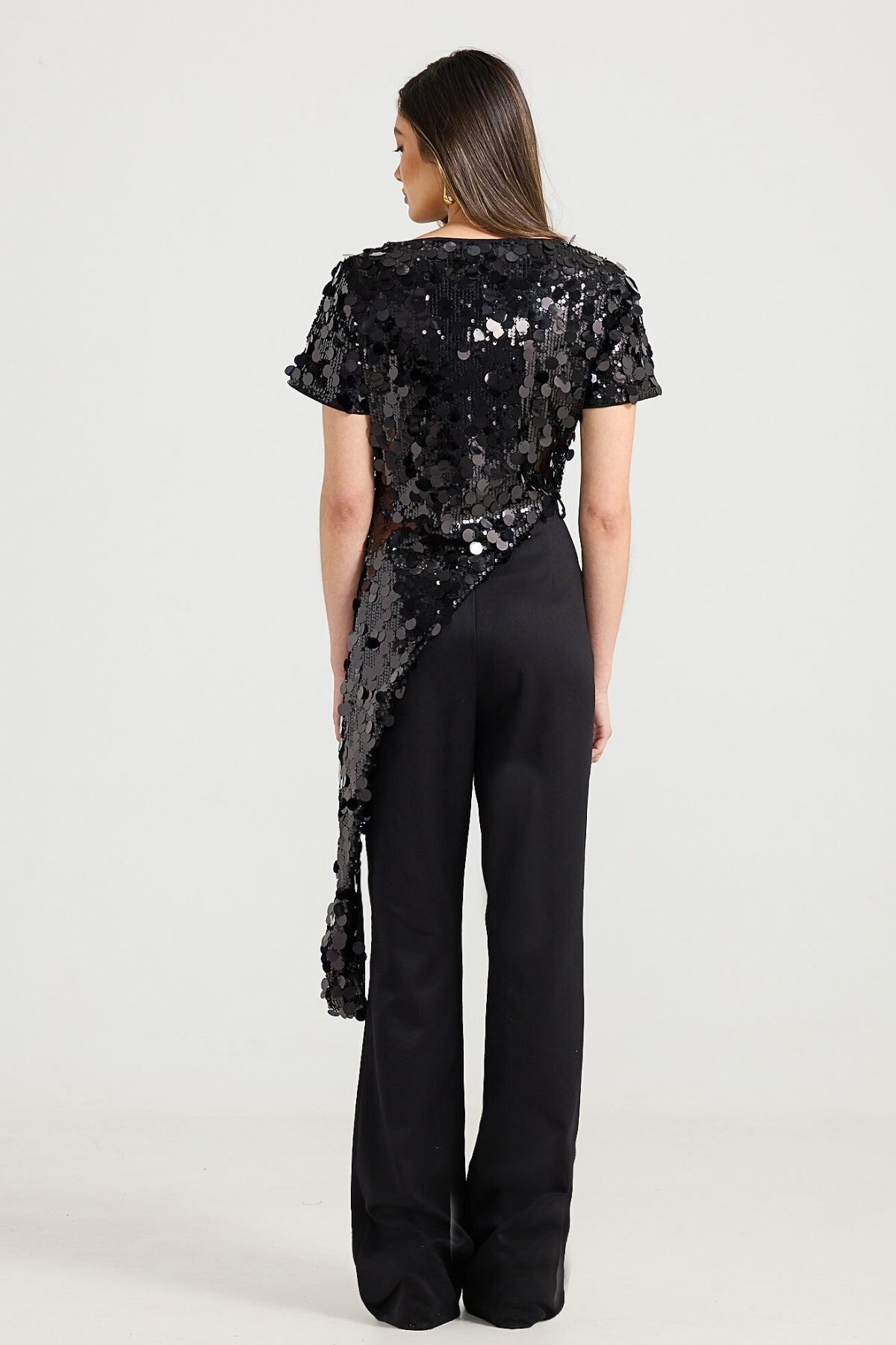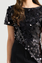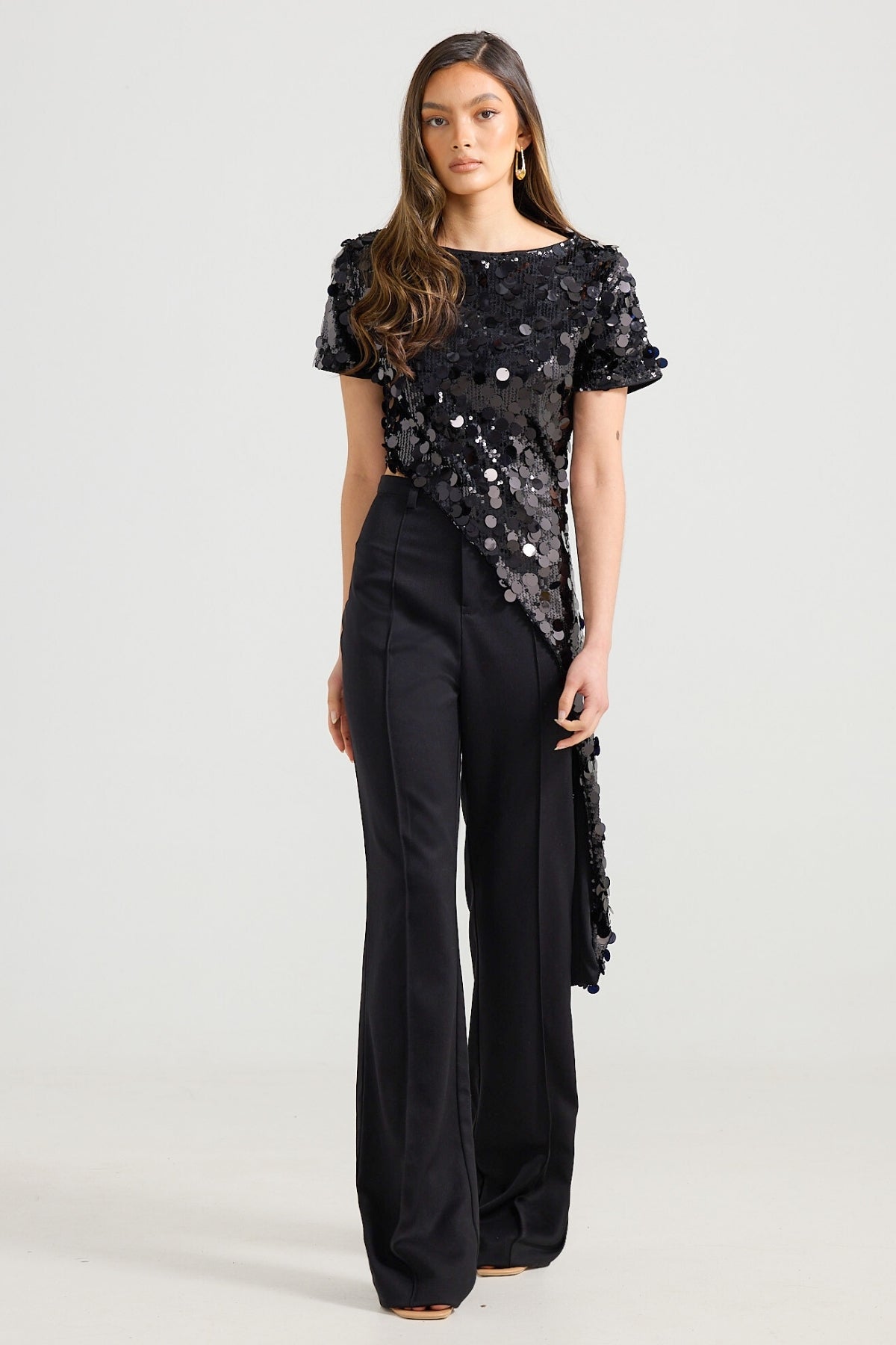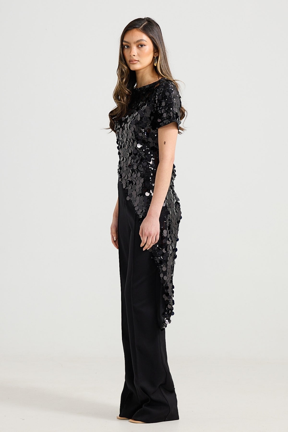 Elevate your wardrobe with the Venus top. The mirrored sequin top is designed to bring a touch of glamour and sophistication to any outfit. Featuring a boat neckline and an eye-catching asymmetrical hem, this top is perfect for making a stylish statement whilst being comfortable. Available in silver and black.