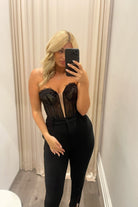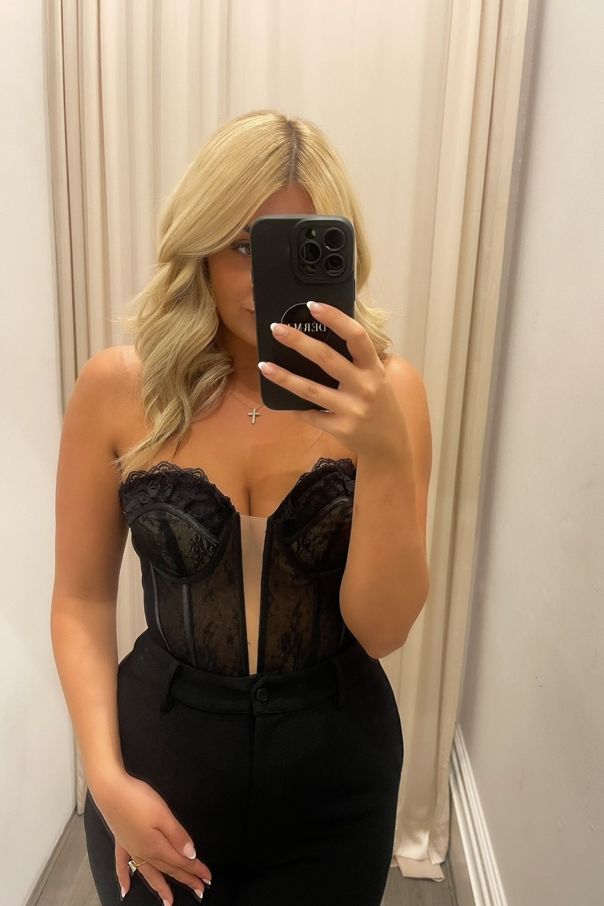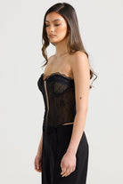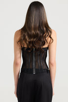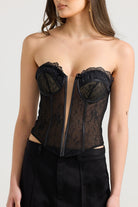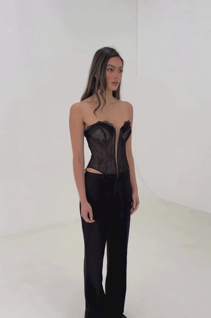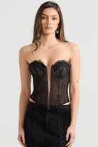 The Vera Corset Top intertwines structure with elegance. Its sheer lace corsetry includes intricate details and features a sweet heart neckline and deep plunge in a sheer skin-tone mesh. Brought to life in beige and black to pair back with almost any bottoms.