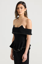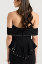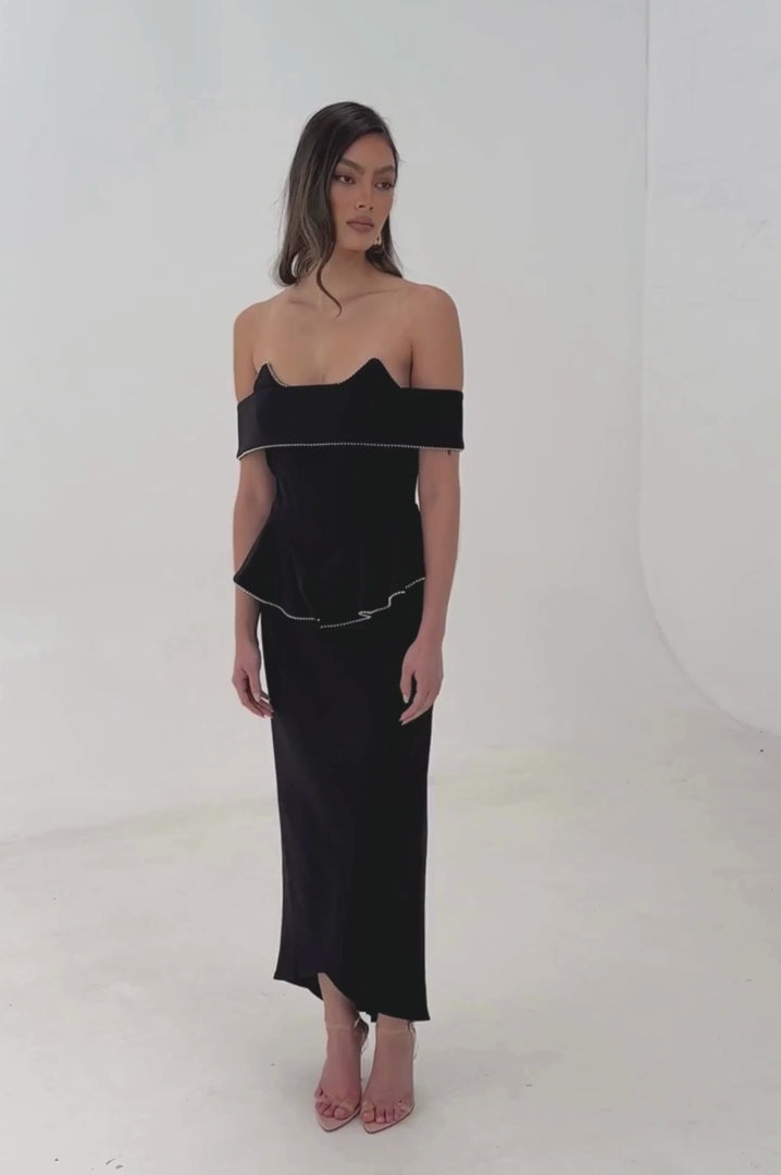 Welcome Zendaya, a pointed corset dress with an off the shoulder panel curated to turn heads. Detailed with a unique studded trim, and contrasting body-con skirt, Zendaya is one to enamor. This number is constructed in our premium bonded crepe stretch fabrication and features a peplum at waist to show off the feminine form. Elevate this dress with metallic accessories. Available in Black and Grey Mauve.