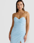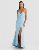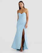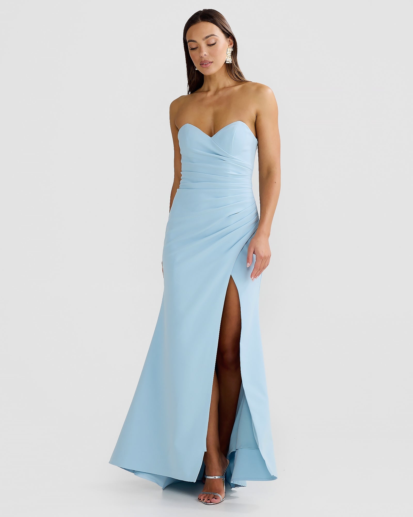 The Sierra Gown is a classic and modern evening silhouette. Featuring a sweetheart neckline that beautifully accentuates the décolletage, this gown is designed to fit and form the female shape. Tucks carefully placed by our artisans, creating a flattering silhouette for all shapes. The thigh slit adds a touch of allure, while the structured fabric ensures both comfort and style. Available in Powder Blue and Soft Pink.